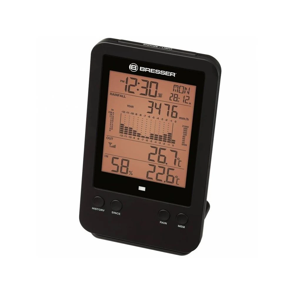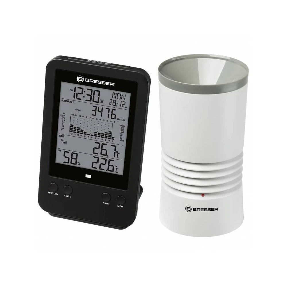 – Pluviomètre avec histogramme- Fréquence du signal radio 868 Mhz avec une portée justqu’à 150 m- Fonction réveil, mesure de la température et humiditéPour tous les jardiniers et les météorologues amateurs ambitieux qui ne veulent pas se contenter de valeurs moyennes des services météorologiques, le pluviomètre numérique radio-piloté de BRESSER offre la possibilité d’effectuer des mesures de précipitation professionnelles.Le pluviomètre professionnel BRESSER affiche des relevés de pluie détaillés en millimètres, mais aussi les températures intérieures et extérieures. Le signal radio du pluviomètre a une portée de 150 m en plein air et une fréquence de 868 Mhz.La station de base mesure la température et l’humidité intérieures, le pluviomètre mesure également la température extérieure. Sur l’écran vous pouvez lire la pluviosité pour une période sélectionnable (heure, jour, semaine, mois). L’affichage contient aussi un histogramme graphique.Caractéristiques :- Mesure des précipitations- Réception et affichage de l’horloge radio DCF- Alarme réveil avec fonction Snooze- Alarme de température extérieure (avertissement de gel)- Températures extérieure et intérieure (en degrés Celsius ou Fahrenheit)- Humidité intérieure- Histogramme- Fonction SINCE (affichage de la précipitation totale à partir d’un certain instant)- Affichage des valeurs minimales et maximales- Rétroéclairage- Alimentation par piles (station : 2x AA, capteur : 4x AA – non incluses)- Couleur : noir- Matériel : plastique- Garantie étendue : 5 ans- Dimensions du pluviomètre : 109 x 109 x 200 mm- Poids du pluviomètre : 375 g- Dimensions de la station de base : 95 x 23 x 154 mm- Poids de la station de base : 198 gContenu de la boîte :- Pluviomètre- Station de base- Support amovible- Matériel de montage- Mode d’emploi