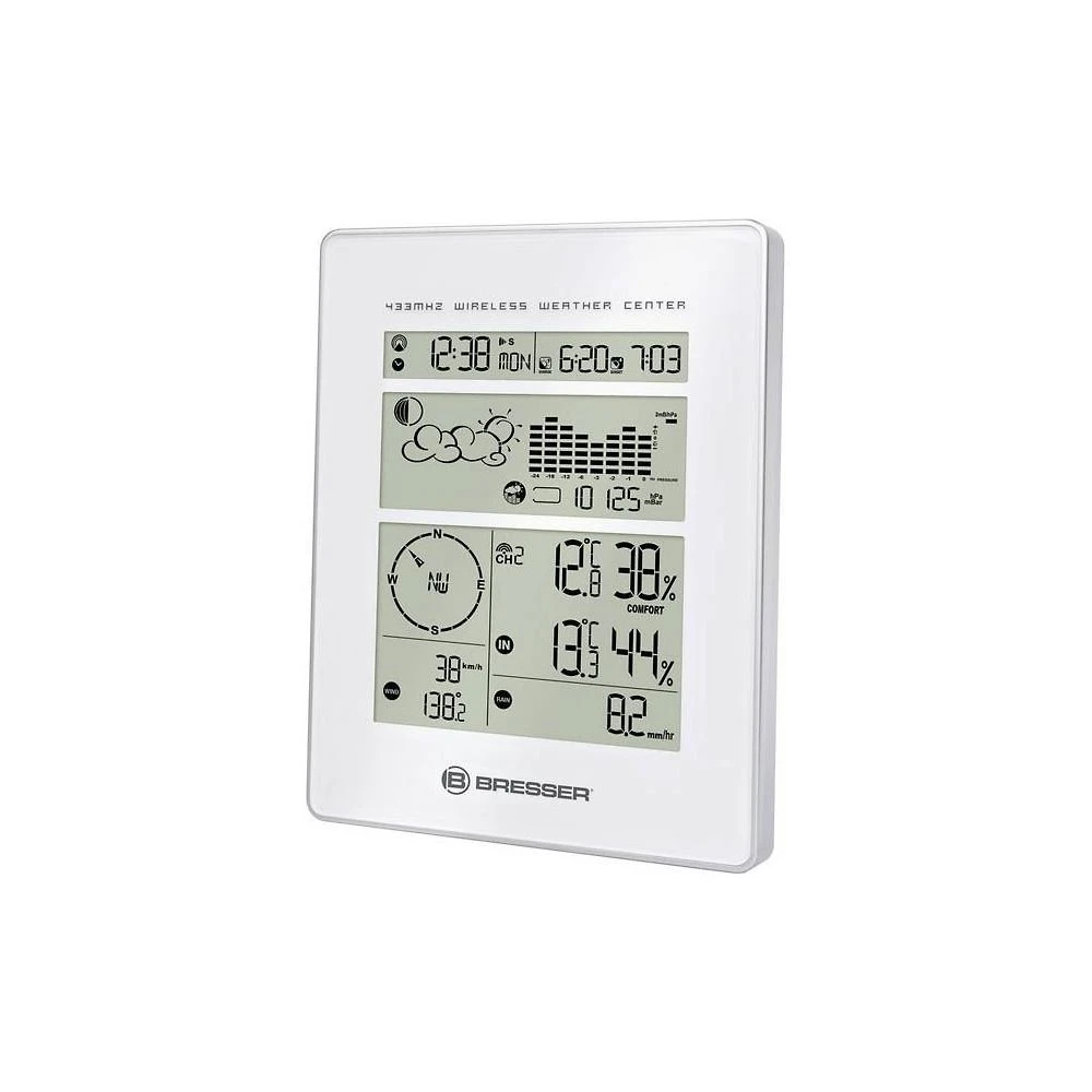 Station météo radiopilotée affichant la température extérieure et le taux d’humidité de l’air. L’anémomètre permet de mesurer la vitesse et le sens d’orientation du vent. Le pluviomètre indique la quantité d’eau tombée. Il affiche également les prévisions météorologiques, l’heure, la date, la pression de l’air, et l’heure de coucher et de lever du soleil. Les informations seront enregistrées par le Weather Center.L’installation des capteurs extérieurs s’effectue simplement et rapidement puisque tous les appareils transmettent les informations par signal radio indépendamment les uns des autres.- Station de base : 148 x 193 x 39 mm, 580 g- Pluviomètre : 163 x 177 x 119 mm, 290 g- Capteur thermo/hygrométrique : 55 x 101 x 24 mm, 65 g- Dimensions de l’anémomètre : 405 x 375 x 160 mm, 315 g- Nombre de capteurs max. : 5- Fonctions : température intérieure, horloge radiopilotée (DCF77), date, température extérieure, jour de la semaine, affichage des tendances, valeurs max/min- Humidité de l’air extérieure : de 0 à 99%- Température extérieure : de -20 à +60 degrés Celsius- Humidité de l’air intérieur : de 0 à 99%- Température intérieure : de 0 à +50 degrés Celsius- Pression de l’air : de 500 à 1100 mbar- Précipitations : de 0 à 1999,9 mm- Vitesse du vent : de 0 à 199 km/h- Portée max. en champ libre : 100 m- Capteur tension d’alimentation : 2x piles LR6 (AA), incluses- Alimentation en tension station : 4x piles LR6 (AA), incluses- Prévisions météorologiques : 12 à 24 heures- Affichage : numérique- Précision de l’humidité de l’air : +/- 5%- Intervalle de mesure : de 33 à 183s