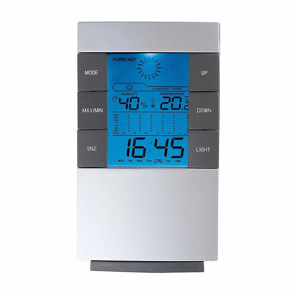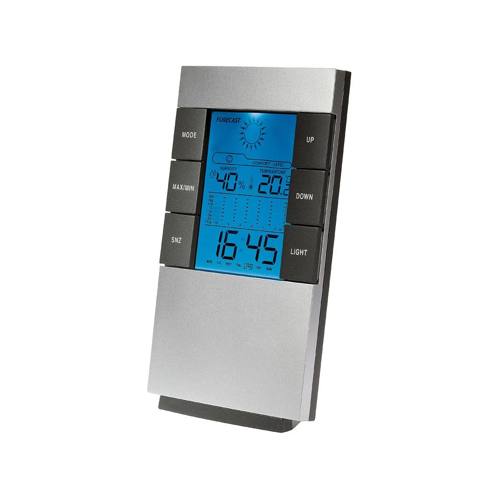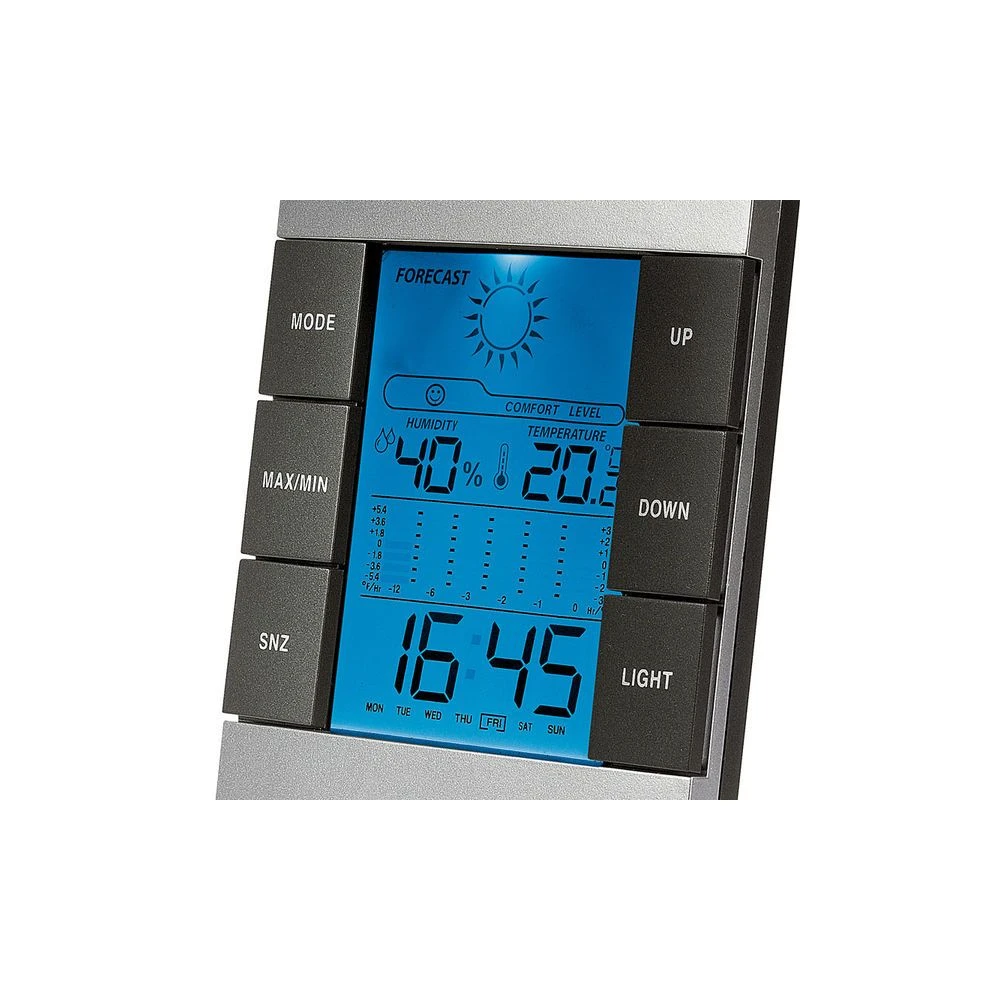 Station météo, prévisions météo, picto météo animé, thermomètre, hygromètre, mémoire des min./max. pour la température et lhygrométrie, indication des températures des 12 dernières heures, calendrier perpétuel avec jour de la semaine, alarme, mode 12/24 heures, rétro-éclairage bleu, pied amovible, fixation murale ou sur socle