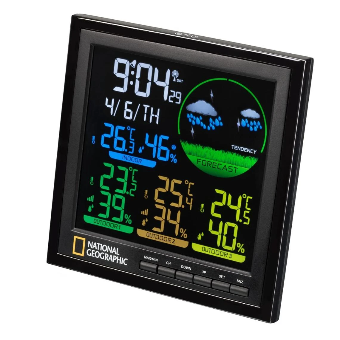 Points forts Divers Marques Station météo écran couleur LCD 4 plages de mesure NATIONAL GEOGRAPHIC – Intérieure Extérieure, Radio pilotage, 3 Capteurs inclus