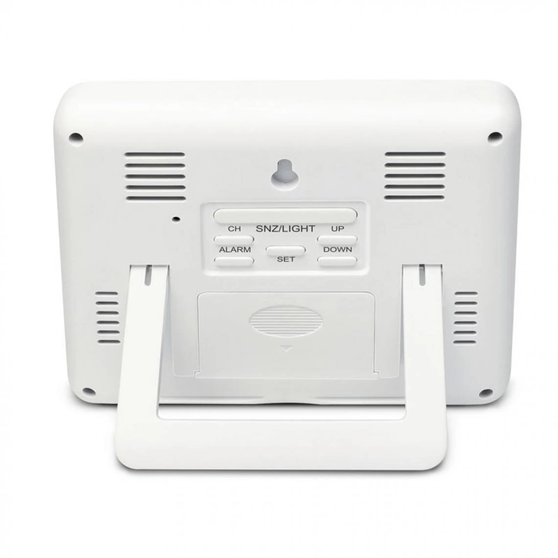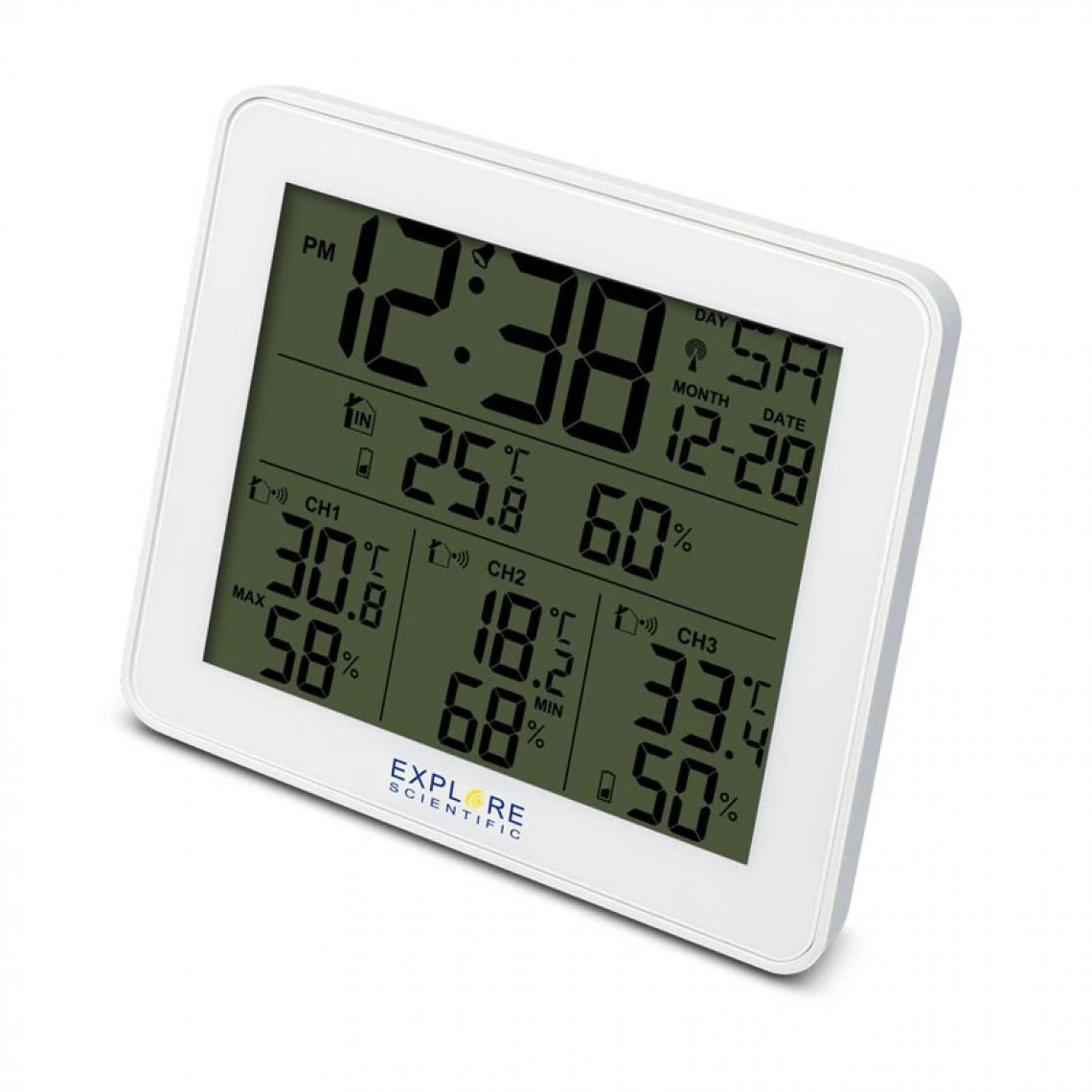 Le thermo hygromètre Explore Scientific dispose d’un large écran LCD. Cette interface permet l’affichage de l’heure et du calendrier, des température et humidité ambiantes et également des températures et humidités de trois emplacements différents. Il est fourni avec 3 capteurs sans fil.Caractéristiques :- Mesures de 4 emplacements différents : 1 sur la base et 3 avec les capteurs sans fil- Température intérieure : de 0 à 50 degrés Celsius- Température extérieure : de -50 à 70 degrés Celsius- Humidité intérieure et extérieure : de 20 à 95 %- Prévisions météo à 12 heures- Date, heure radio pilotée, jour de la semaine- Alarme de réveil- 3 capteurs inclus d’une portée de 80 m- Fixation murale ou position sur table- 3x piles AAA (incluses)- Longueur : 130 mm- Largeur : 18 mm- Hauteur : 120 mmCaractéristiques du capteur :- Mesures des températures et humidités intérieures et extérieures (3 capteurs incl.)- Fixation murale ou position sur table- Dimensions : 50 x 25 x 95 mm- 2x piles AAA (incluses)Contenu de la boîte :- Base principale- 3x capteurs- 3x piles AAA (thermo-/hygromètre)- 2x piles AAA (capteur)- Mode d’emploi