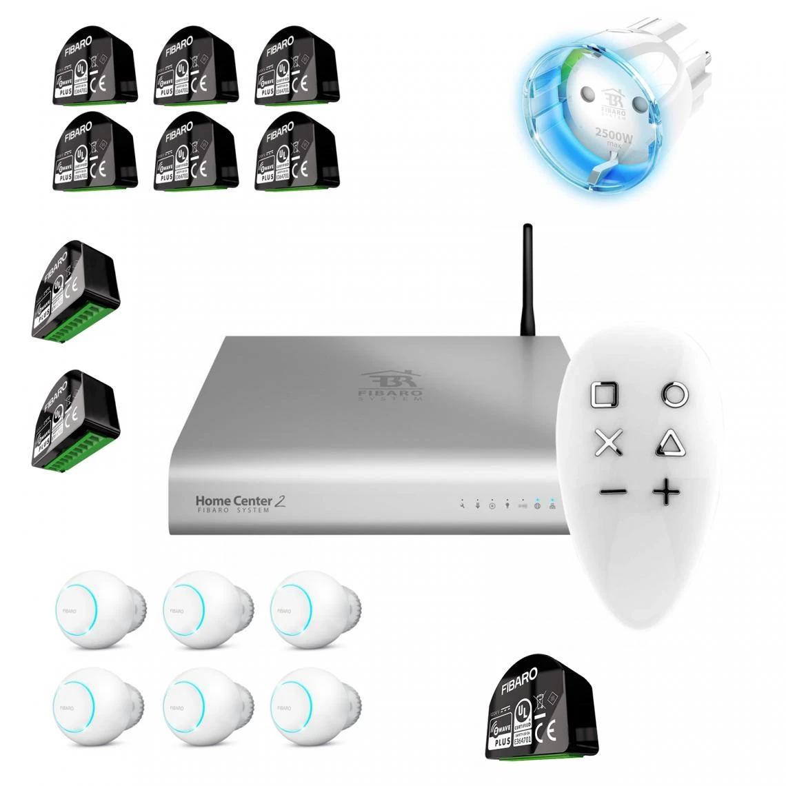 Pack domotique Z-Wave : Box domotique et modules Fibaro Profitez de cette offre pack Fibaro pour équiper la maison et gérer les principaux équipements depuis la box domotique Home Center 2 : volets roulants, éclairages, prise connectée, appareils électroménager… Ce kit évolutif peut être complété à tout moment d’autres modules Z-Wave ou accessoires Home Center 2 Fibaro : box domotique le cerveau du système La box Home Center 2 est l’élément principal du système domotique auquel sont connectés tous les autres accessoires qu’elle va coordonner. Elle collecte les informations transmises par les divers modules domotiques, les analyse et retransmet les ordres en fonction des paramétrages qui ont été effectués. La création de scénarios domotiques pilotés par la Home Center 2 sont bénéfiques sur plusieurs aspects : amélioration de la consommation d’énergie, augmentation de la sécurité et de la protection de la maison, historique des actions. Cette box Fibaro permet la gestion de la maison à distance ou selon un mode semi-automatisé afin de gagner en confort et en praticité au quotidien. Fibaro : évolutivité du système domotique grâce aux nombreuses compatibilités La box domotique Fibaro Home Center 2 offre de multiples possibilités d’évolution et d’associations grâce à sa compatibilité avec de nombreux systèmes, marques et équipements. Il est possible d’intégrer au système domotique Fibaro des éléments venant d’autres technologies ou fabricants tels que : Philips Netatmo Danalock Yale Samsung D-Link Yamaha… La box Fibaro s’utilise également avec les assistants vocaux Amazon Alexa et Google Assistant pour un pilotage encore plus facile et intuitif La gestion de la maison toujours accessible et adaptée à votre rythme Depuis l’application Fibaro vous accédez à distance et dès que vous le souhaitez à la gestion de la maison. Vous pouvez vous assurer que tout se passe bien, vérifier que vous avez bien éteint certains appareils et contrôler le fonctionnement des équipements. Où que vous soyez, depuis un PC, une tablette ou un smartphone, vous pouvez consulter l’activité de la maison, l’historique et si besoin ajuster certains paramétrages ou piloter en direct la mise en marche/mise à l’arrêt de certains modules. La mise en place de scénarios et les modes de commandes faciles et intuitifs : application, panneaux de contrôle, assistants vocaux… permettent de bénéficier d’une maison toujours adaptée à vos besoins et à vos habitudes. Le confort, la sécurité et la consommation d’énergie sont maximisés. Sécurité de données et stabilité du réseau Le fonctionnement de la box Home Center 2 garantit la protection des données grâce aux technologies employées et précautions mises en place telles que : un accès protégé avec système WAF et anti DDOS, un protocole de communication dédié, des connexions chiffrées, une sauvegarde automatique des données… La box et ses périphériques forment un réseau avec une communication mutuelle et la possibilité de répéter le signal via des modules (comme les prises connectées) pour étendre la portée. Les accessoires du pack maison connectée Z-Wave Fibaro Ce kit inclut des modules domotiques permettant de commander à distance différents équipements de la maison depuis une télécommande ou depuis l’application domotique. 6 modules domotiques Z-Wave+ Fibaro – Commande sans fil de volets roulants Ce module encastrable se fixe derrière un interrupteur afin de commander à distance et sans fil un moteur de volet roulant, store ou store vénitien. Il est possible de le piloter à distance via un bouton de commande, depuis l’application domotique ou bien d’automatiser son fonctionnement à travers des scénarios domotiques programmés. 6 têtes thermosatiques intelligentes Fibaro Le contrôle du chauffage simple et efficace. Au lieu d’une seule unité de commande, FIBARO propose des têtes intelligentes et coopérantes que vous pouvez installer sur chacun de vos radiateurs. Où que vous soyez et à tout moment, vous pouvez gérer manuellement, à distance, par la voix, à l’aide de l’application, le chauffage dans toutes les pièces de votre maison. Cette tête thermostatique offre un haut niveau confort thermique et de nombreuses possibilités : Mesure précise de la température Les horaires avec la possibilité d’introduire des changements dynamiques Algorithmes innovants pour adapter l’appareil aux conditions de la pièce Réduction significative des coûts de chauffage Économie et confort grâce à la batterie rechargeable intégrée chargée une fois par saison 1 télécommande domotique design et multifonctions Fibaro Dans un design ergonomique et très contemporain, la télécommande Fibaro intègre une multitude de possibilités. Son aspect soigné permet une prise en main facile, ses boutons en relief aux formes géométriques simples sont facilement identifiables et elle s’emporte partout avec soi grâce à son format porte-clé compact et léger. Cette télécommande peut agir sur tous les éléments domotiques de la maison selon la manière dont vous la configurez : ouvrir le portail ou la porte d’entrée, actionner l’arrosage automatique, désactiver l’alarme, allumer les luminaires… 1 module variateur encastrable Z-Wave Fibaro Ce micro-module s’installe directement derrière un interrupteur existant afin de commander un éclairage en mode On/Off ou variation selon le type d’ampoule utilisé. Caché derrière votre installation il ne demande pas d’aménagement particulier et ne dégrade pas la décoration de votre intérieur. Dans son micro format il cumule plusieurs fonctions : interrupteur, variateur et contrôleur d’énergie. Il est compatible avec la plupart des ampoules : LED, Fluo compacte… 2 modules domotiques Single Switch 2 Fibaro Ce petit module est une pièce indispensable d’un s