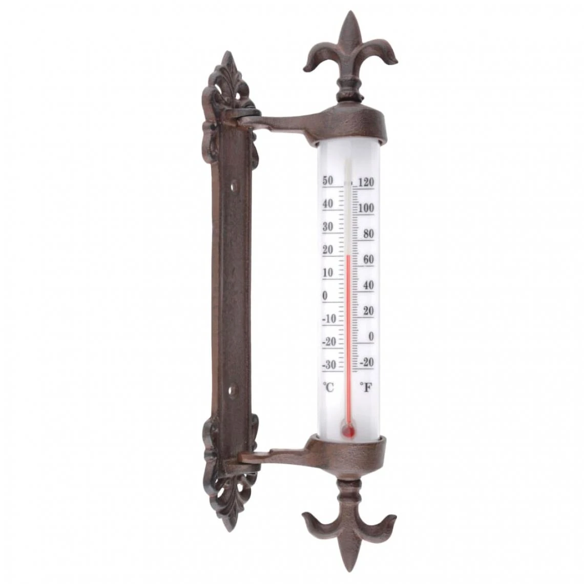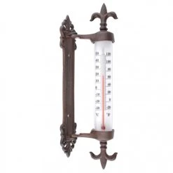 ICAVERNE Contemporain Outils de mesure et détecteurs selection Ankara Esschert Design Thermomètre à cadre de fenêtre Fonte Avec ce thermomètre à cadre de fenêtre en fonte de la marque Esschert Design, vous êtes toujours bien préparé au changement de température ! Grâce à ses grands chiffres et caractères en Celsius et en Fahrenheit, ce thermomètre est clairement lisible pour tout le monde. Le thermomètre est fixé au rebord de la fenêtre, afin de pouvoir mesurer la température intérieure et extérieure. De plus, ce thermomètre mural d’extérieur a une belle finition en fer forgé et une belle fleur de lis à la fois en bas et en haut du thermomètre. Couleur : marron