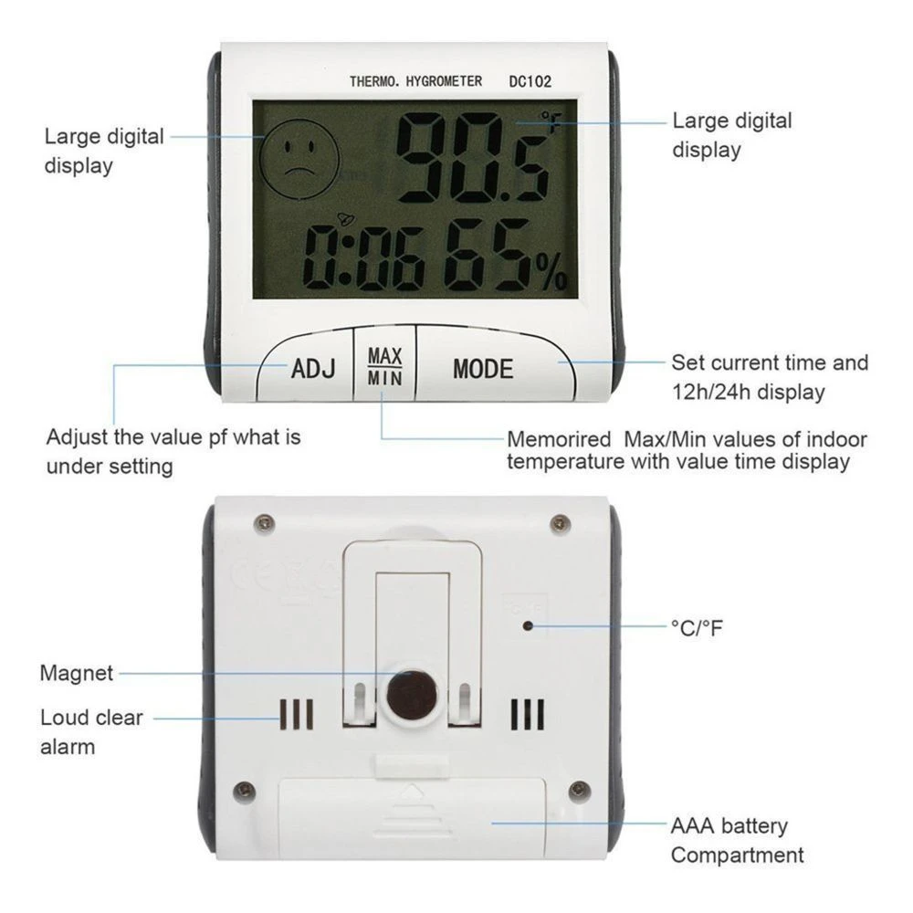 Conception totalement sans fil et montable sur aimant; Affichage de l’heure 12/24 heures; Fonction d’horloge quotidienne; Alimenté par 1x 1.5V AAA batterie non incluse.