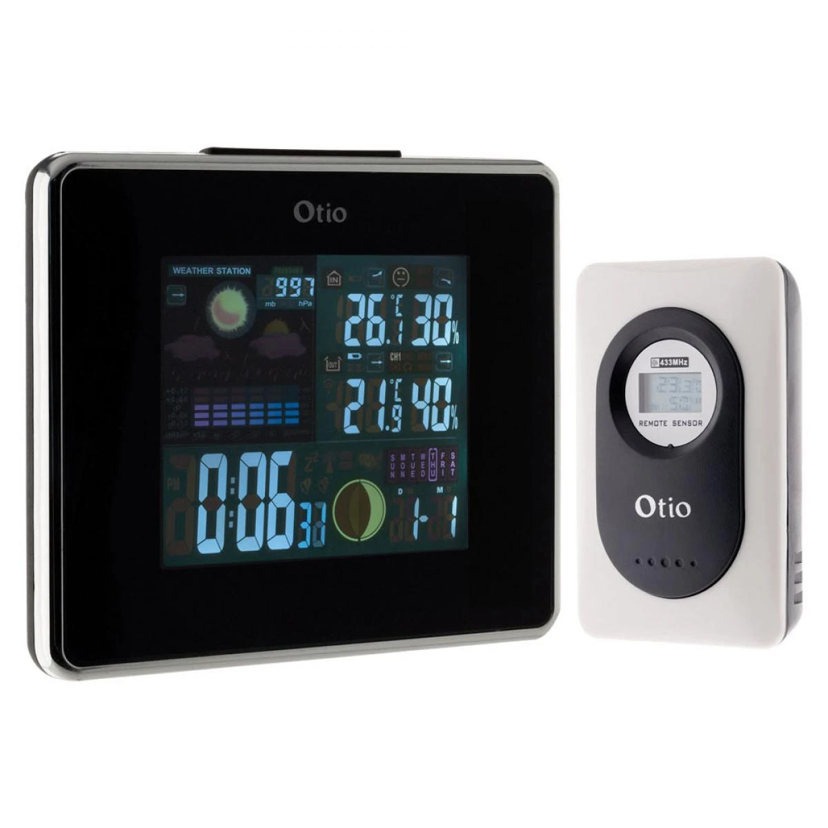 centrale météo couleur avec capteur sans fil 30m – 810036 – La station météo ultra complète 810036 de OTIO possède un grand écran couleur pour une meilleure visibilité des informations. Sur un même écran vous pourrez voir la température et l’hygrométrie intérieur et extérieur, mais également l’heure, la date, les prévisions et même les phases lunaires.