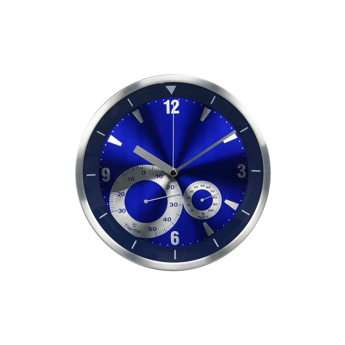 Conçue pour être accrochée au mur, son design classique en bleu électrique, en aluminium avec façade en verre, allie élégance et efficacité. Son mouvement est réglé par un quartz et comprend un thermomètre, un hygromètre et deux cadrans argentés.