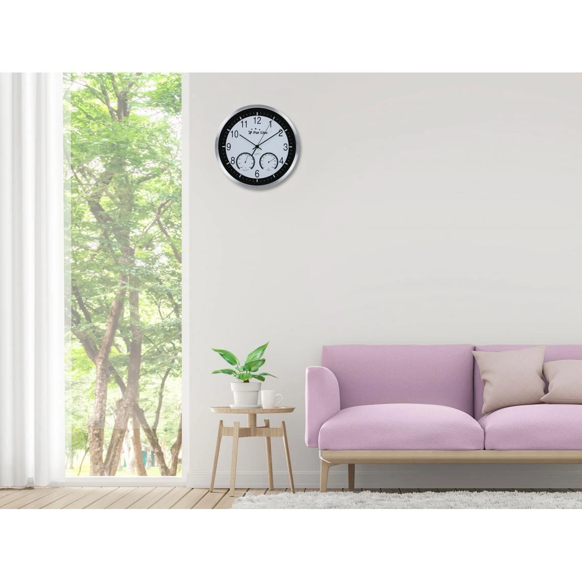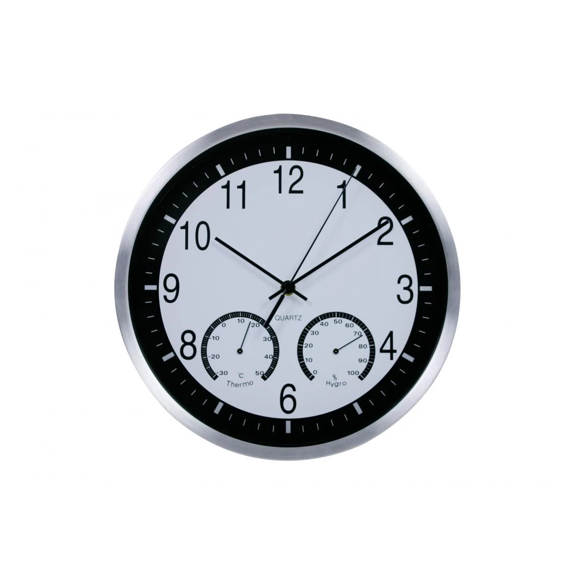 Conçue pour être accrochée au mur, son design classique noir et blanc, en aluminium avec façade en verre, allie élégance et efficacité. Son mouvement est réglé par un quartz et comprend un thermomètre, un hygromètre et deux cadrans.