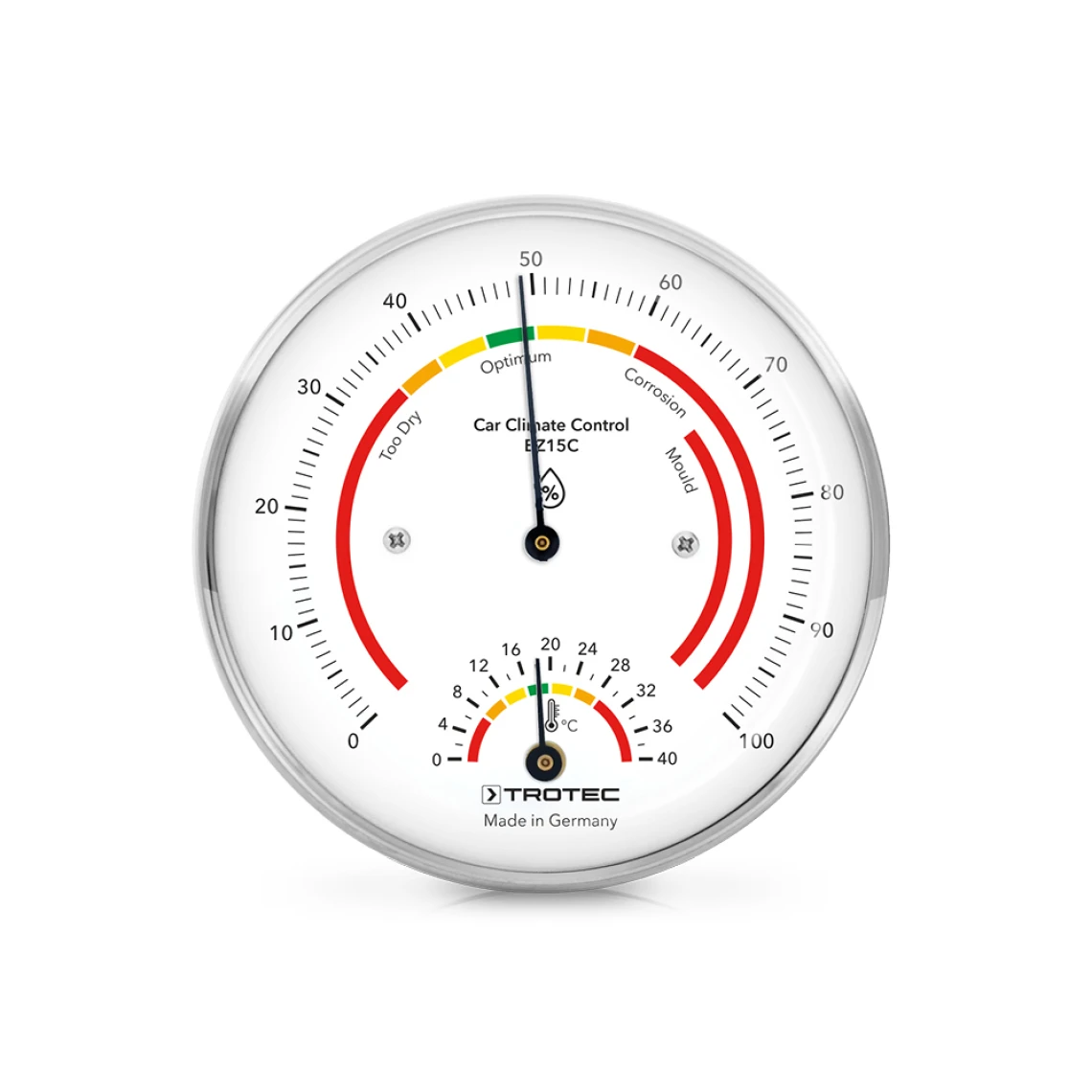 Pour que la rouille et la corrosion ne commencent pas leur travail de destruction et que de la moisissure n’apparaisse pas derrière le tableau de bord, sur les sièges et dans l’habitacle, le taux d’humidité doit se situer entre 45 et 50 % h.r. – c’est la zone verte de l’appareil.